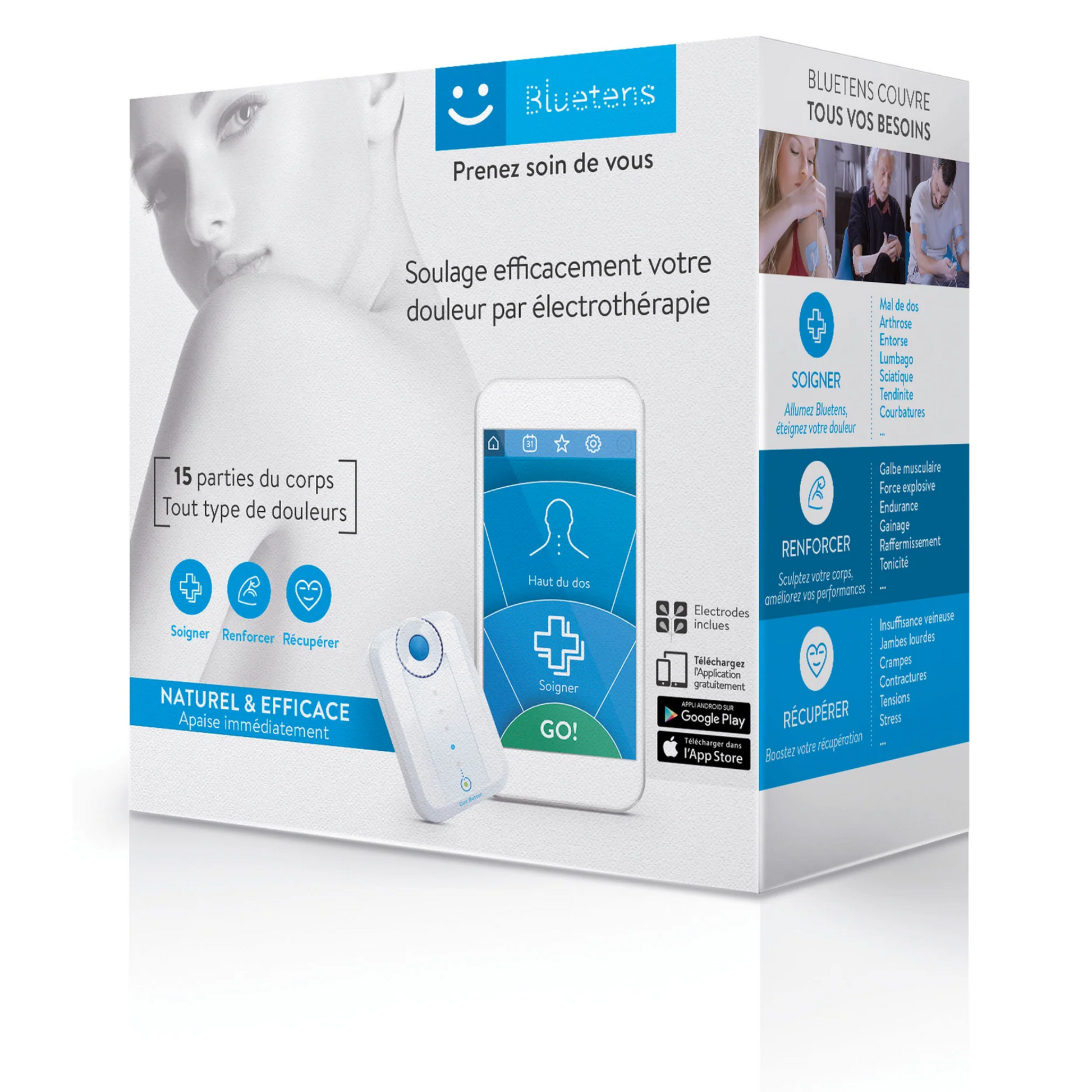 Ultra-compact et léger (seulement 25 g), le Bluetens vous accompagne partout, du cabinet de kiné à la maison. Une charge rapide d’une heure offre jusqu’à 15 jours d’utilisation.