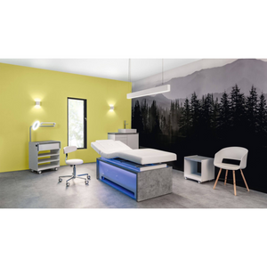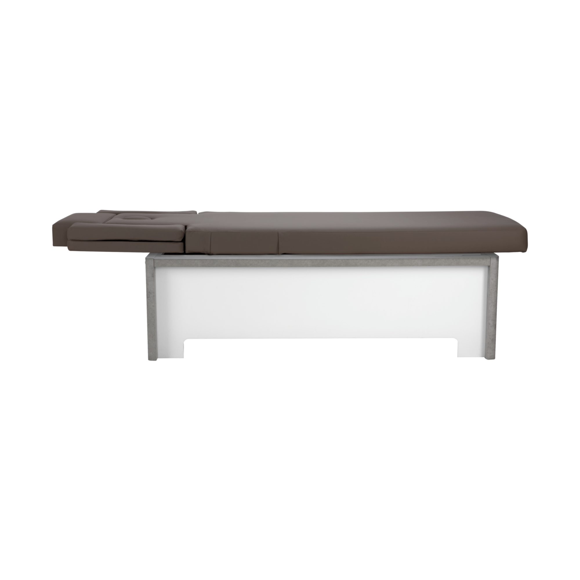 La table de soins est disponible dans les couleurs de tapisserie d'ameublement blanc et moka aussi bien que trois finitions en bois : noyer naturelle, noyer terra et type béton.